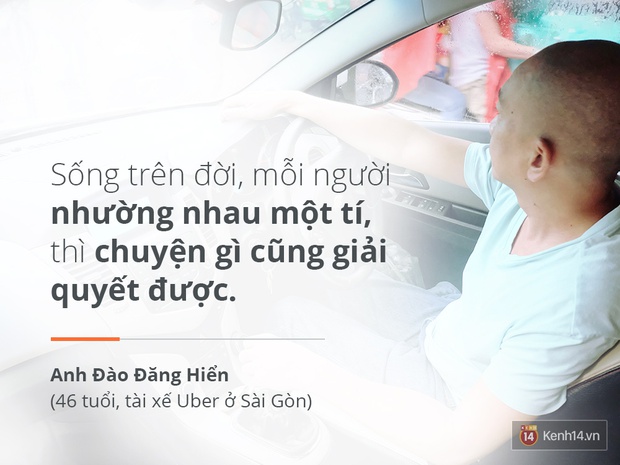 Xe lăn bánh cũng là lúc bác tài quay sang trò chuyện với tôi. Khác với vẻ ngoài “hầm hố” của mình, anh Đào Đăng Hiển (46 tuổi, TP.HCM) lại có một cách nói chuyện rất hài hước và thú vị. Tôi chưa kịp cười với câu chuyện này của anh thì lại cảm thấy thấm thía với những câu nói đầy chất đời của người tài xế này. Cứ thế tôi dường như bị cuốn vào 1001 câu chuyện của anh lúc nào không hay và bất chợt quên rằng mình đang khá mệt mỏi sau một ngày làm việc dài.