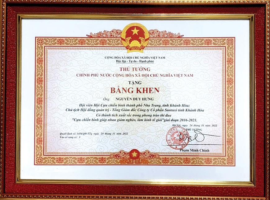 Cựu chiến binh, Chủ tịch, Tổng giám đốc Nguyễn Duy Hưng được Thủ tướng Chính phủ tặng Bằng khen vì có thành tích xuất sắc trong Phong trào thi đua “Cựu chiến binh giúp nhau giảm nghèo, làm kinh tế giỏi” giai đoạn 2016-2021.